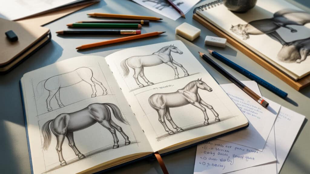 Iedereen maakt fouten, zeker bij het tekenen van grote dieren. Het goede nieuws is dat deze fouten vaak makkelijk te corrigeren zijn. Paard tekenen makkelijk betekent ook accepteren dat niet alles meteen klopt. Veel beginners lopen tegen dezelfde valkuilen aan. Door ze te herkennen, leer je sneller. Dat versnelt je groei en houdt het tekenen leuk. Fouten zijn geen mislukking, maar aanwijzingen.
