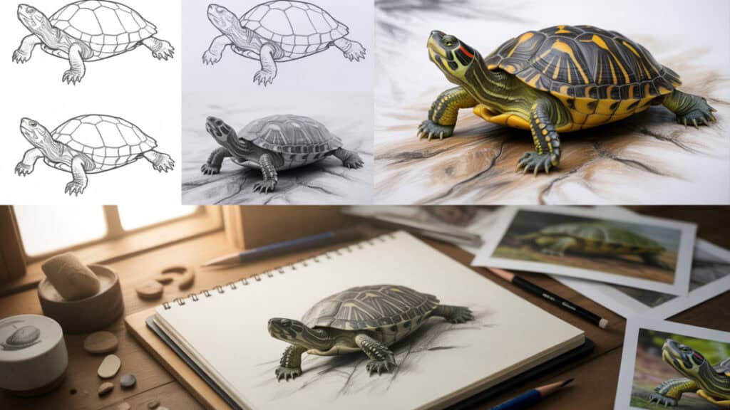 Een sterke tekening begint altijd met een goede basis. Bij schildpad tekenen makkelijk draait deze fase om het vereenvoudigen van het dier tot herkenbare vormen. Door eerst globaal te schetsen, behoud je overzicht en controle.